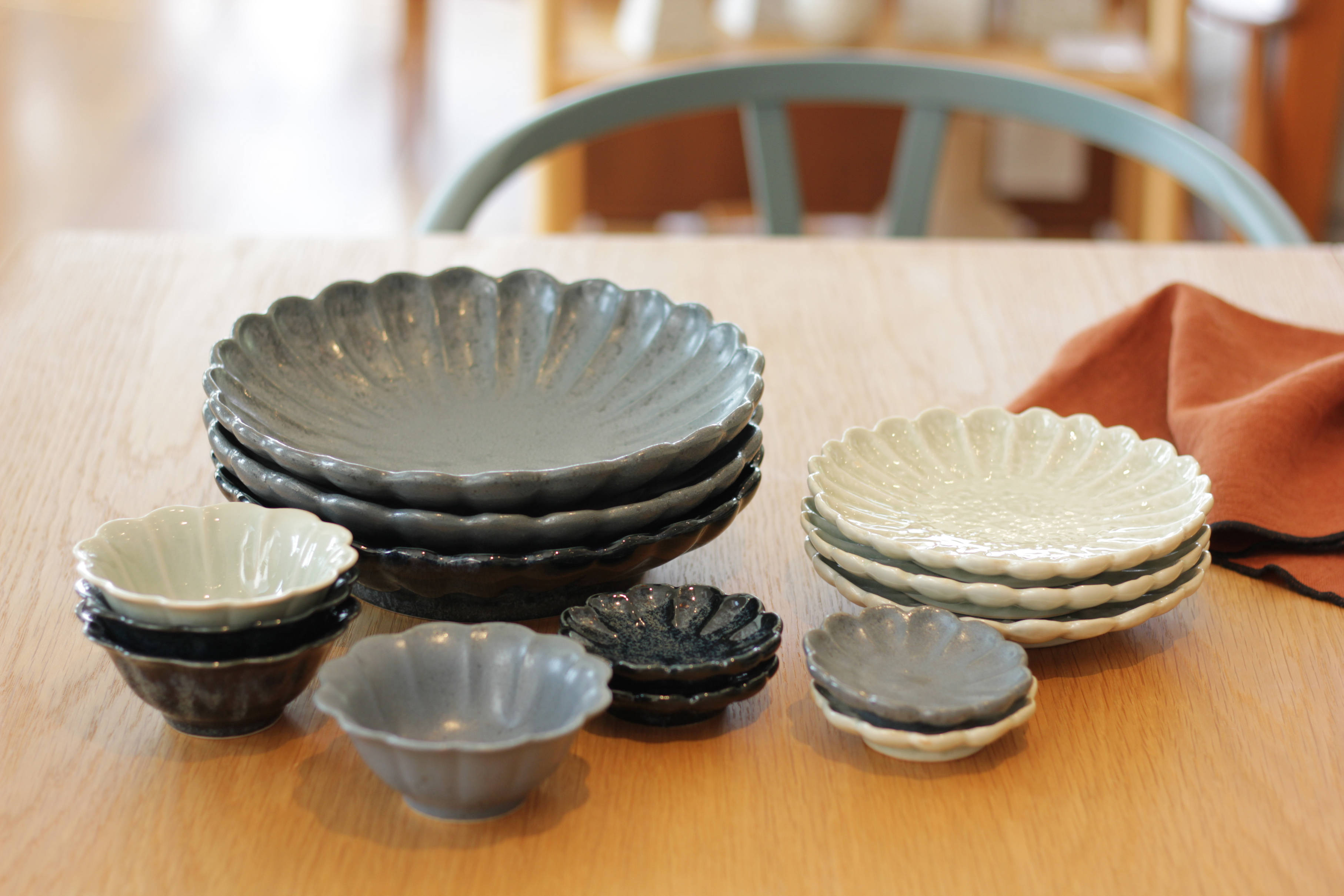 たくさんの料理を盛り付けるのにちょうどいい大皿から取り分け用のお皿、深めの小鉢に小皿まで。