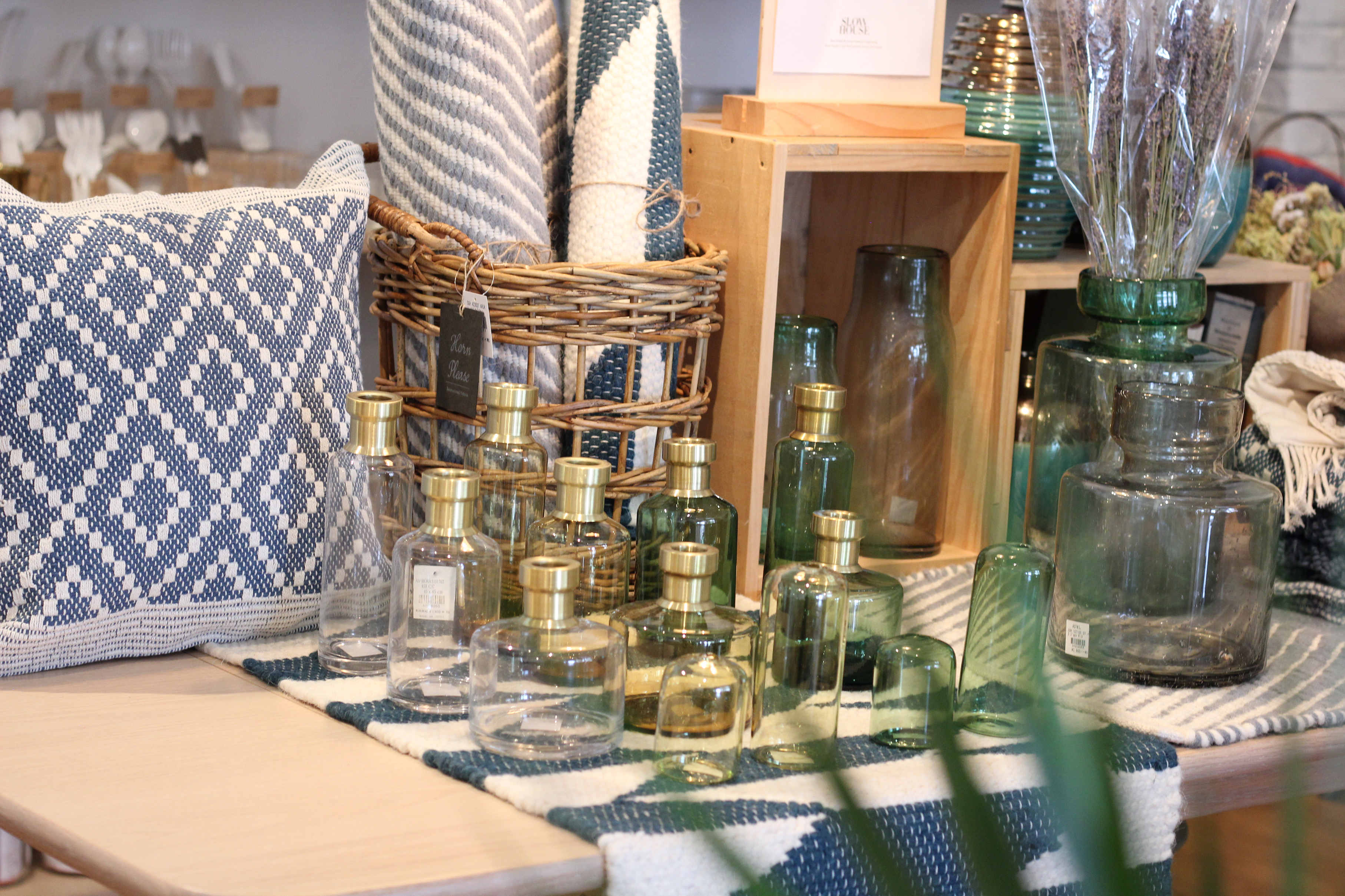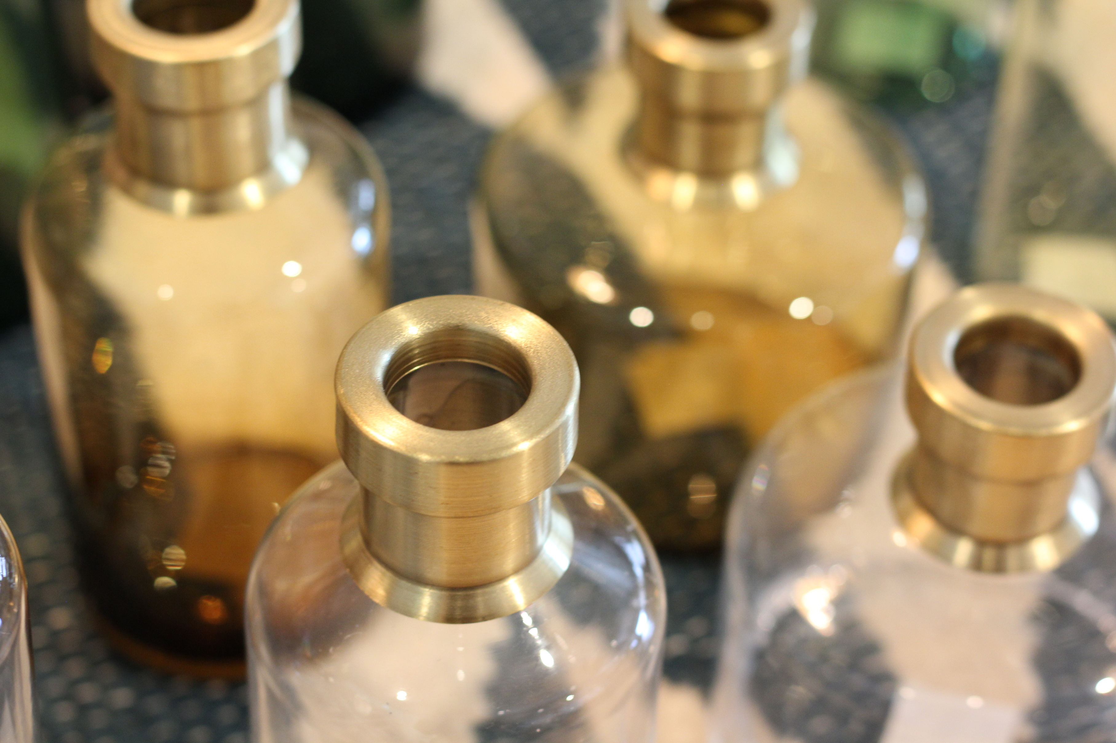 カラーガラスとトレンドの真鍮のキャップを組み合わせたフラワーベースは