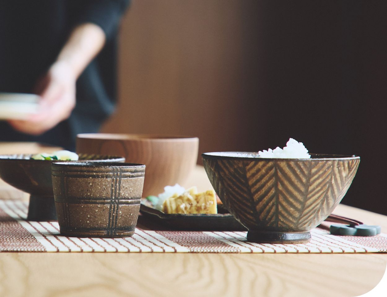ぼんやりとしがちな土物の器の印象をキリっと引き締め、現代の食卓に馴染むモダンな佇まいに仕上げています。