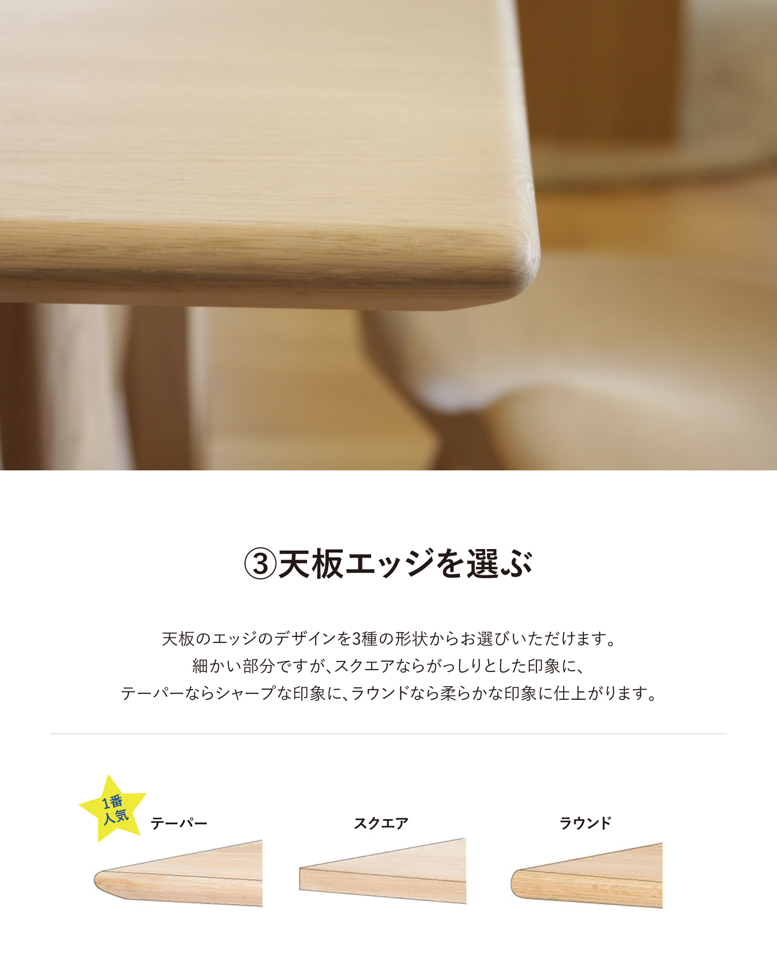 ワンパターンになりがちなダイニングテーブルですが、SOUPシリーズはお部屋の雰囲気や好みに合わせてサイズや仕様を楽しみながら選んでいただけることで、2018年のデビューから多くのお客様にご愛用いただいています。
