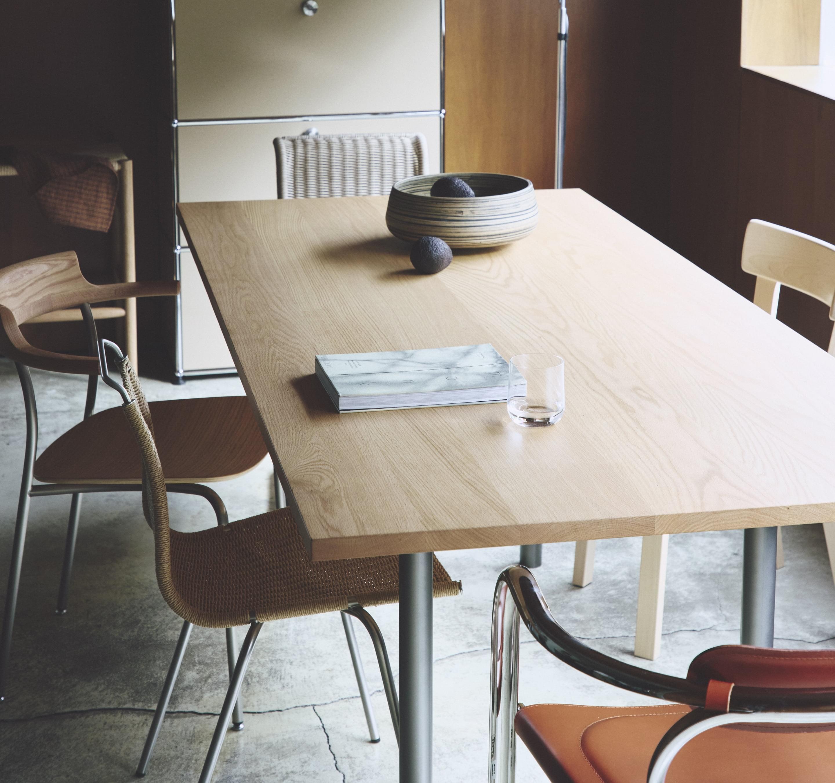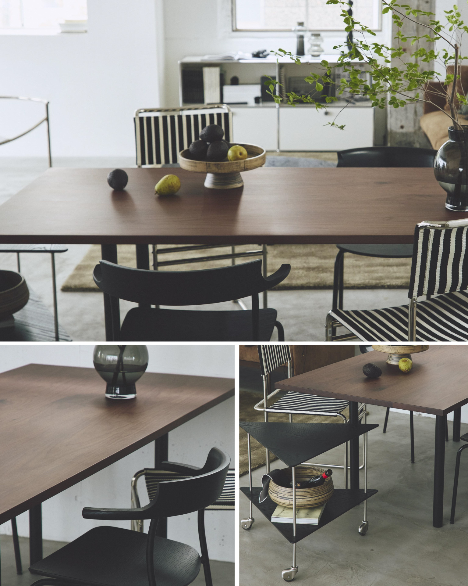 無垢材の天板にスチールレッグのシャープなラインや光沢が加わることで空間にメリハリが生まれ、大型家具特有の圧迫感がやわらいで広々として整った印象を与えるという利点もあります。