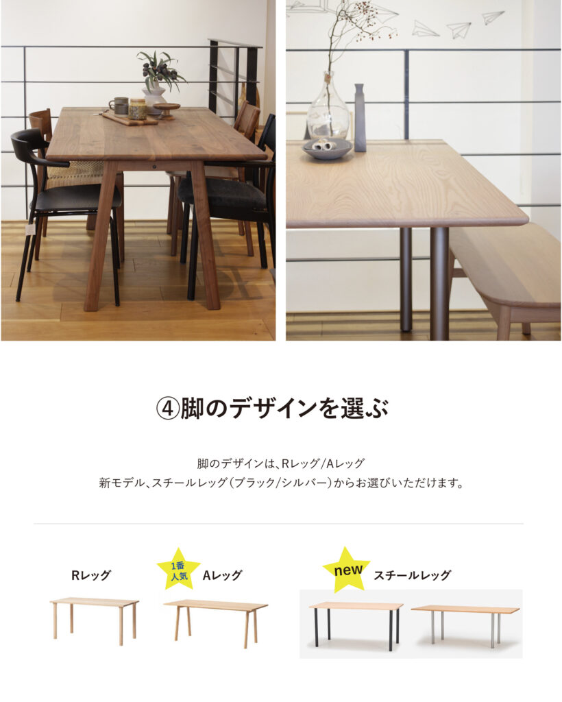 無垢材を使ったセミオーダーのダイニングシリーズ「SOUP(スープ)」から、新しくスチールレッグが登場しましたのでご紹介します。